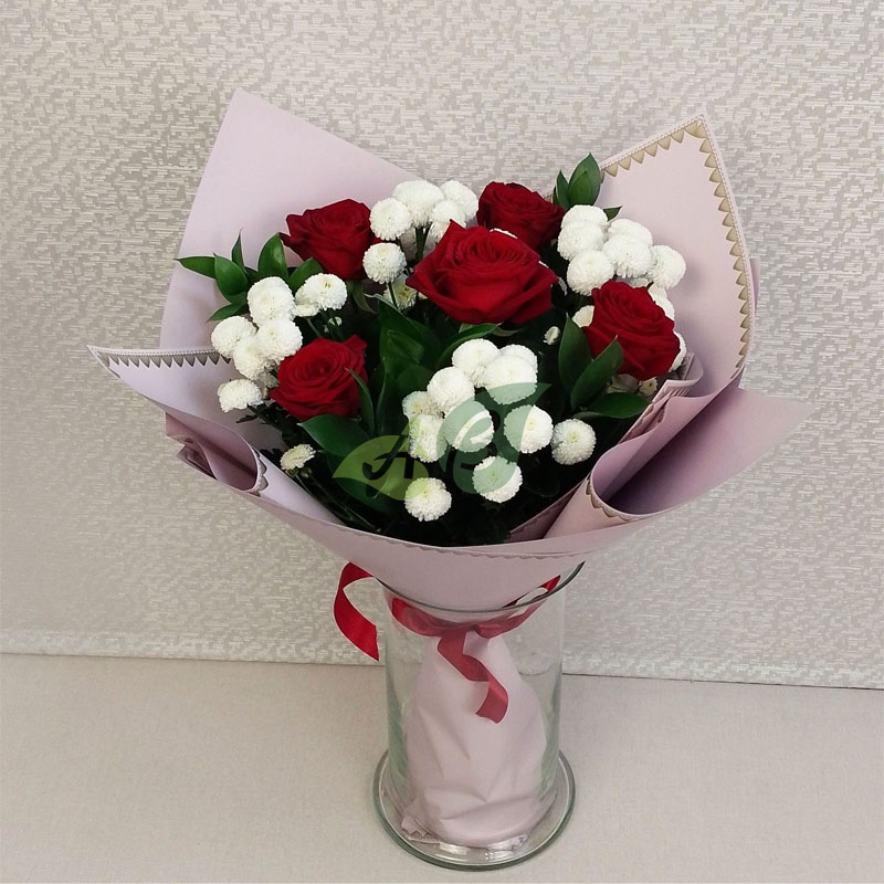5 красных роз в сочетании с белой хризантемой и зеленью рускуса выглядит просто великолепно. Он говорит о вкусе дарителя, о том, что он ценит неповторимость того, кому предназначен этот букет.